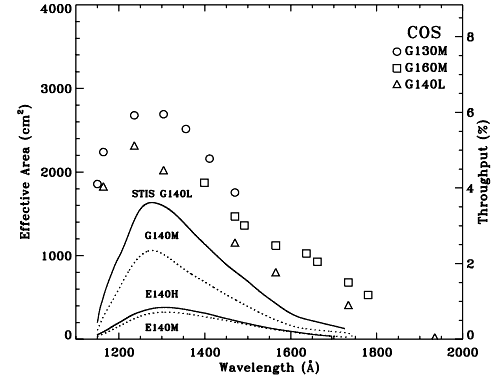 Figure 3: HST/COS FUV effective areas and throughputs. Values for several STIS modes are also shown for comparison with the COS values. All values are system end-to-end values that include the performance of the HST OTA, as described by Burrows (1988). All STIS values shown assume full slit transmission.< 2200 Å.