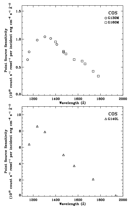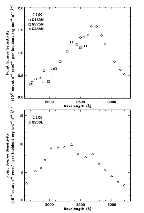 Table 5: COS/STIS Sensitivity ComparisonNote: Backgrounds are not included in the listed sensitivities. In background- limited situations, the expected S/N calculated from these numbers must include background information, and comparisons of different instrument modes will depend upon the details of the background and the spectral bin size adopted. Values for all STIS modes assume 2 pixels per resolution element and no slit transmission losses. Use of the 0.2 x 0.2 arcsec aperture reduces the STIS values by factors of 1.3 (2800 Å) to 1.8 (1300 Å). Use of the 0.2 x 0.06 arcsec slit reduces the STIS values by factors of 1.7 (2800 Å) to 2.6 (1300 Å). The STIS echelle values do not account for scattered light, which is a substantial component of the background (especially for E140M); including echelle scattered light will further reduce the STIS values of S.