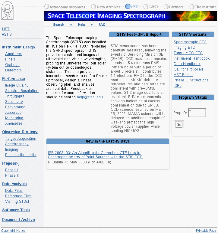The STIS web pages include up-to-date information about STIS operations and performance. Links to this information are organized into categories and sub-categories which are listed in a menu on the left hand side of all STIS group web pages. In addition to these main categories, a "shortcuts" list of links to frequently used resources is displayed on the right hand side of most STIS web pages. You can also search for specific information, as all STIS documentation is indexed on STIS-specific keywords.
