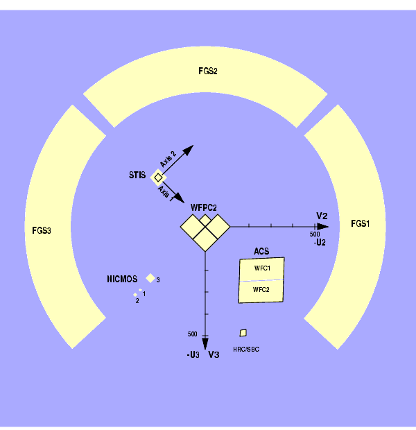 Figure 3.2: HST Field of ViewAXIS1and the slits are parallel toAXIS2. The policy for applying for parallel observing is described in the Call for Proposals. We provide suggestions for designing parallel observations with STIS in Section 12.8. While the STIS CCD can always be used in parallel with another instrument, there are some restrictions on the use of the MAMA detectors in parallel, as described in Section 2.7.