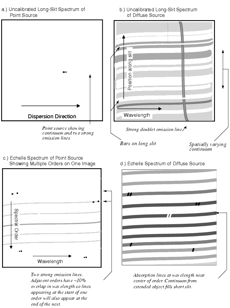 There are 15 spectroscopic modes which are summarized in Table 4.1 below. They comprise low and intermediate-resolution first-order modes designed to be used with a complement of long slits over the entire wavelength range, and intermediate and high-resolution echelle modes which have been optimized for point-source observations through short echelle slits and are available only in the ultraviolet (see Figure 4.2).