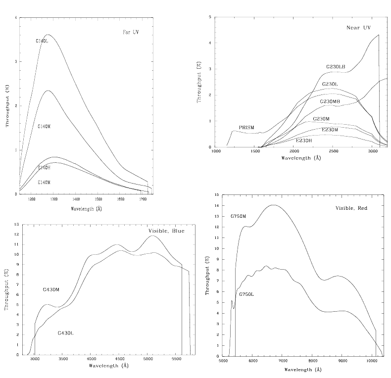 To illustrate the broad wavelength coverage provided by STIS, and the relative throughputs achievable across STIS's wavelength regime, we show in Figure 4.1 the system throughput of the four low-resolution, first-order modes on a single plot (where the throughput is defined as the end-to-end effective area divided by the geometric area of a filled, unobstructed, 2.4 meter aperture). To allow you to judge the relative throughputs of different spectroscopic configurations, we plot in Figure 4.2 the efficiency of all grating modes for each of the four primary wavelength regimes on a common plot. These plots allow you to gauge the relative efficiencies of STIS in different configurations. Note, however, that these curves give the throughput at the time that STIS was initially calibrated (approximately 1997.7). Throughput changes in the first-order modes, determined from monitoring observations since STIS was installed, are discussed in Chapter 13. The throughput curves shown for the echelle modes trace the peak of the echelle blaze function for each order; throughputs near the ends of each order are lower by ~ 20 to 40%.