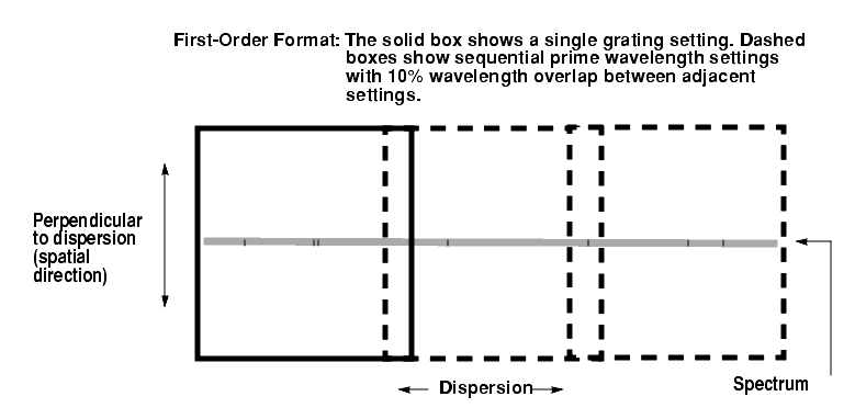Figure 4.5: Scanned First-Order GratingsE140M), only a portion of the full spectral range of the grating falls on the detector in any one exposure, and the gratings must be scanned (tilted) with a separate exposure taken at each tilt position, in order to cover the full spectral range (see Figure 4.5 and Figure 4.6 below). Accordingly, for these scanned gratings, the user may select a single exposure at a given wavelength, or a series of exposures at different wavelengths to cover a larger wavelength range. The user must choose either prime or secondary settings. The prime settings cover the full spectral range with 10% wavelength overlap between observations taken at adjacent settings. The secondary settings cover selected absorption or emission lines and may be more convenient to use in some applications. We expect the photometric and wavelength calibration accuracies to be higher for the prime settings than for most of the secondary settings, as calibrations for the latter will be inferred from those taken at prime settings. A few frequently used secondary settings are being calibrated directly as noted in Chapter 13. The central wavelengths, and corresponding minimum and maximum wavelengths, are presented in the individual grating sections in Chapter 13.