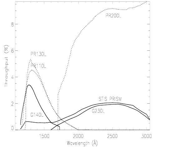 Figure 4.4: The total system throughputs for the STIS G140L, G230L and NUV-PRISM modes (solid lines) are compared with the ACS SBC PR110L and PR130L and the ACS HRC PR200L prisms (dotted lines).PR200Lwith the HRC, andPR110LandPR130Lwith the SBC. Figure 4.4 shows a comparison of the transmissions of the ACS prisms and the STIS prism and low-resolution gratings. Note that the STIS prism uses the NUV-detector for the entire wavelength range; as a result the ACS prism has much higher sensitivities at FUV wavelengths. On the other hand, the STIS prism allows the entire wavelength range of 1150 to 3600 Å to be covered in a single exposure. Also, an appropriate slit can be used with the STIS prism whereas the ACS prism can be used only in slitless mode. While the ACSPR200Lhas a much higher throughput and wider spectral range than any of the STIS spectroscopic configurations, this comes at the price of a much lower dispersion, especially at the long wavelength end. Observers should carefully consult theACS Instrument Handbookbefore choosing between STIS and ACS slitless spectroscopy.
