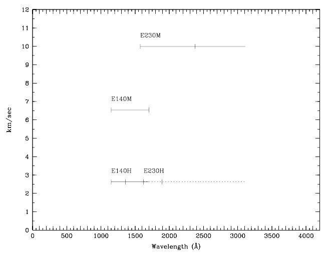 There are four echelle grating modes which provide spectroscopic coverage from 1150 Å to 3100 Å at resolving powers from R~30,000 to R~110,000. Through simultaneous observation of multiple orders, they are designed to maximize the spectral coverage achieved in a single exposure of a point source. Figure 4.11 below summarizes the wavelength coverage and kinematic resolutions of the echelle gratings. In short:
