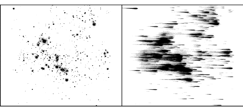Figure 4.12: NUV-MAMA image (left) and objective-prism exposure (right) of NGC 604, a Scaled OB Association, obtained under GO program 9096. The dispersion direction is nearly parallel to the x-axis.PRISMcan be used at two wavelength settings, 1200 and 2125 Å. These are approximately the wavelengths that will lie at the center ofAXIS1on the detector for the two settings. The relationship between wavelength and pixel number along the central spectral trace is shown in Figure 4.13 for each setting. The dispersion as a function of wavelength is shown in Figure 4.14 for each setting.
