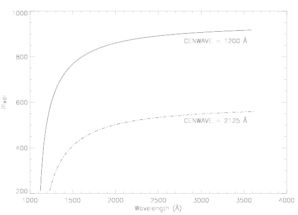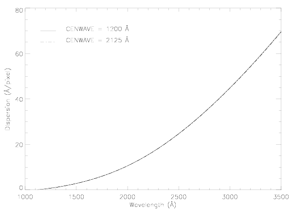 Figure 4.14: Dispersion as a function of wavelength for the PRISM at wavelength settings 1200 Å (solid) and 2125 Å (dot-dash). The lines for the two settings nearly overlap.
