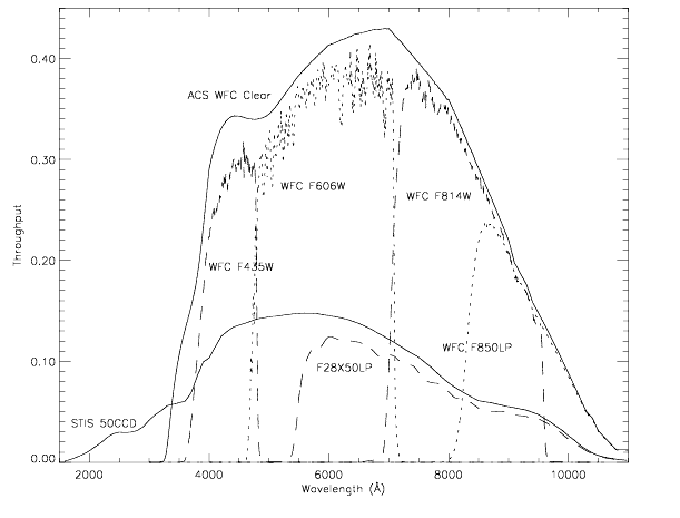 Figure 5.1: The total system throughputs of the STIS50CCDandF28X50LPconfigurations are compared to the throughputs of several broad band ACS WFC filters.