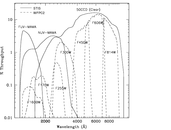 In Figure 5.6 above, we show the throughput (where the throughput is defined as the end-to-end effective area divided by the geometric area of a filled, unobstructed, 2.4 meter aperture) of the three STIS clear imaging modes, with the CCD, the NUV-MAMA, and the FUV-MAMA. Superposed on this plot, we show the broadband WFPC2 throughputs. In Figure 5.7, Figure 5.8, and Figure 5.9, we show the throughputs of the full set of available filters for the CCD, the NUV-MAMA, and the FUV-MAMA, respectively.