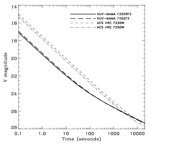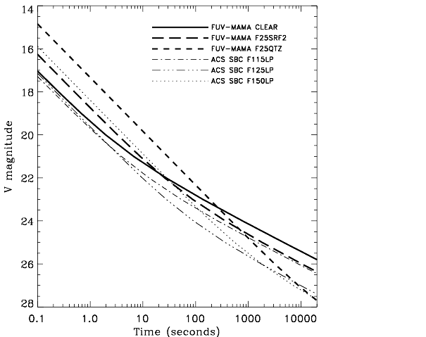 Figure 5.3: Exposure time required to reach S/N=10 versus the target V magnitude, for various STIS NUV-MAMA and ACS HRC filtered configurations, assuming a B1 V target spectrum. The relative sensitivities of the various configurations will depend strongly on the shape of the target object's spectrum