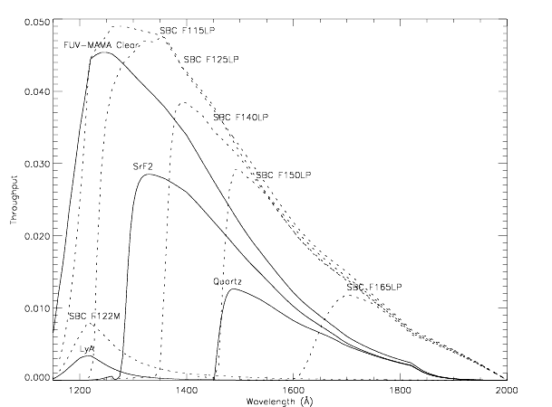 Figure 5.4: The throughputs of STIS FUV-MAMA configurations (solid lines) are compared with the filtered ACS SBC detector throughputs (dotted lines).