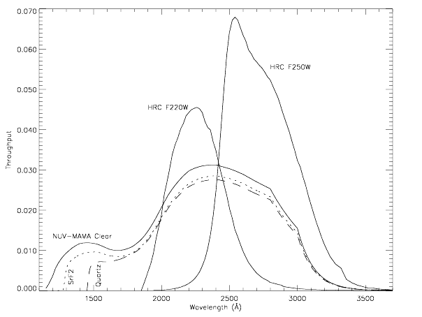 Figure 5.2: The throughput of the NUV-MAMA with the25MAMA,F25QTZ, andF25SRF2apertures is compared with that of the ACS HRCF220WandF250W.