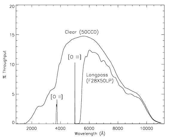 50CCDaperture have significantly higher sensitivity to faint sources than WFPC2 (see Figure 5.6). The CCD long-pass imaging filter,F28X50LP, has similar sensitivity longward of 5500 Å. The STIS CCD also has a low read noise and dark current; thus STIS CCD observations with the clear or long-pass apertures are extremely sensitive to faint sources (see Figure 5.6). The STIS CCD clear imaging mode is especially useful when no color information is needed, for example, for finding faint variable sources, or imaging the faintest possible sources in a given integration time.- The wings of the point-spread function in the STIS CCD imaging modes are suppressed by an internal Lyot stop. This feature provides a significant advantage for detecting faint sources near much brighter sources.
