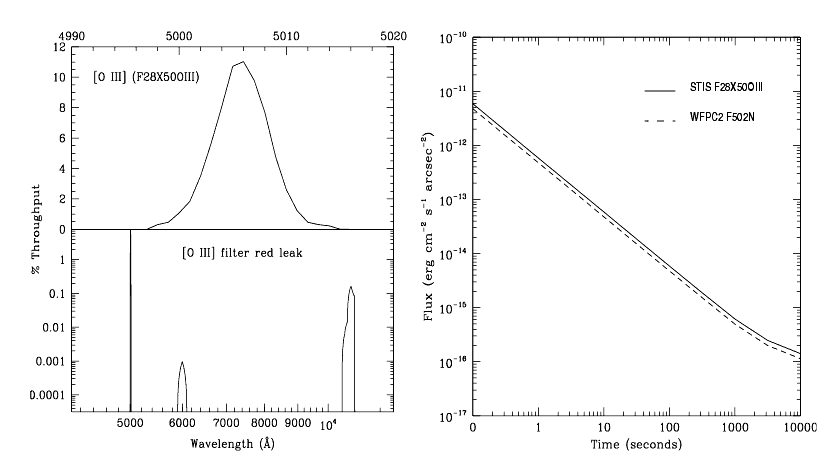 This filter images a 28 x 50 arcsecond field of view and can be used in target acquisitions or for direct imaging in the light of [O III]. The [O III] filter integrated system throughput and a signal-to-noise comparison with the WFPC2 [O III] filter are shown in Figure 5.11 (see also F28X50OIII-CCD for sensitivities, and signal-to-noise and saturation plots). The STIS [O III] filter is very narrow: only 5 Å wide, compared to the WFPC2 [O III] filter which is roughly 30 Å wide. The STIS [O III] filter has a substantial red leak that begins at 10,600 Å and continues to at least 12,000 Å. In the case of a very red star (K0 spectral type), the red leak will contribute approximately one third of the detected counts. The red leak for this filter is included in the passbands used by the