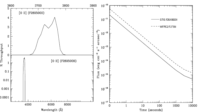 The [O II] filter images a 28 x 52 arcsecond field of view and can be used in target acquisitions or for direct imaging in the light of [O II]. The [O II] filter integrated system throughput and a signal-to-noise ratio comparison with WFPC2's [O II] filter are shown in Figure 5.12. See page 404 for sensitivities, signal-to-noise and saturation plots.
