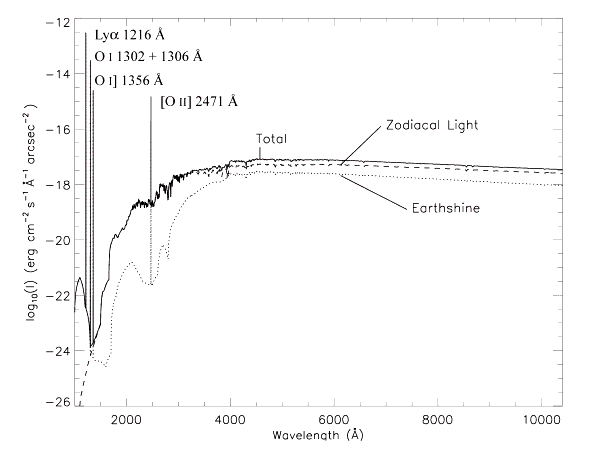 Figure 6.1: High Sky Background Intensity as a Function of Wavelength. The zodiacal contribution corresponds to mv = 22.7 arcsec-2. The Earthshine is for a target which is 38 degrees from the limb of the sunlit Earth. The upper limit to the [OII] 2471 Å intensity is shown. Use Figure 6.2 to estimate background contributions at other angles. The geocoronal airglow line intensities are in erg cm-2 s-1 arcsec-2..