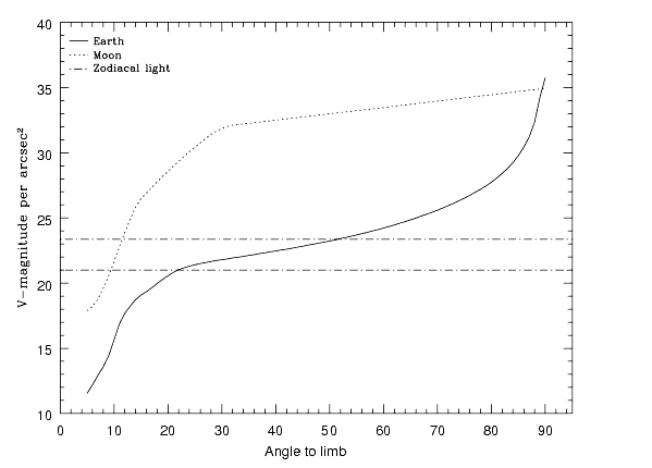 Earthshine, on the other hand, varies strongly depending on the angle between the target and the bright Earth limb. The variation of the Earthshine as a function of limb angle from the sunlit Earth is shown in Figure 6.2. The figure also shows the contribution of the Moon which is typically much smaller, and the full range of the zodiacal contribution. For reference, the limb angle is approximately 24° when the HST is aligned toward its orbit pole (i.e., the center of the CVZ).