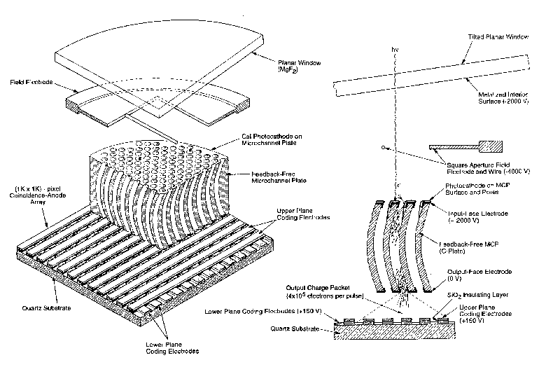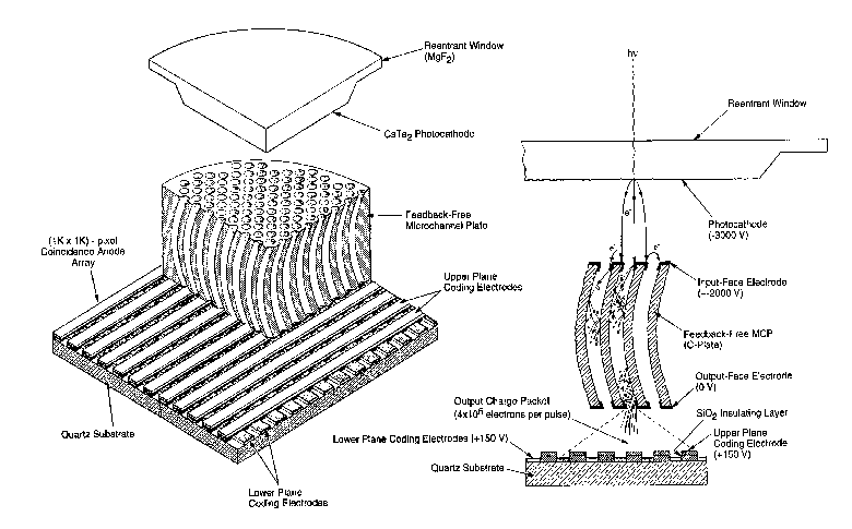 Figure 7.11 and Figure 7.12 illustrate the design of the FUV- and NUV-MAMA, respectively. A photocathode material is deposited on the front surface. The FUV-MAMA has an opaque CsI photocathode deposited directly on the face of the curved microchannel plate (MCP); the NUV-MAMA has a semi-transparent Cs2Te photocathode deposited on the back side of the detector's entrance window.