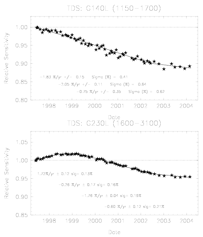 Figure 7.13: Relative sensitivity of STIS MAMA first-order low-resolution modes G140L and G230L as a function of time..G140Lhas been confirmed to be -0.30%/ºC. No significant change with temperature for the NUV-MAMA first-orderG230Lmode has been registered. Following a correction for the temperature dependence, the sensitivities of the FUV first-order modes decrease linearly with time (see Figure 7.13) by wavelength-dependent amounts ranging up to a few percent per year. For the NUV first-order configurations, the sensitivities increased during the 1.5 years of STIS operations and then began to drop, by wavelength-dependent amounts comparable to those in the FUV (see Figure 7.13). There has been a significant slow-down in the decline of the time-dependent sensitivity (TDS) of all STIS observational modes in the last two years. Currently, MAMA sensitivity losses range on average from -0.75%/yr (G140L) to -0.60%/yr (G230L). Full details of the changes in the sensitivity over time for all STIS first-order L and M spectroscopic configurations can be found in STIS ISR 2004-?. TDS corrections for all first-order MAMA spectra have already been implemented in the data-reduction pipeline (see Section 15.1). All OTFR retrievals of such data will have corrected fluxes regardless of their acquisition epoch with an accuracy of 1% or better. SYNPHOT and the ETC have also been updated to apply TDS corrections to MAMAs. Sensitivity-monitor data for the echelle and MAMA imaging configurations are currently under investigation; they appear to show analogous effects, but no pipeline corrections are yet available. TDS corrections for these modes will be added during Cycle 13.