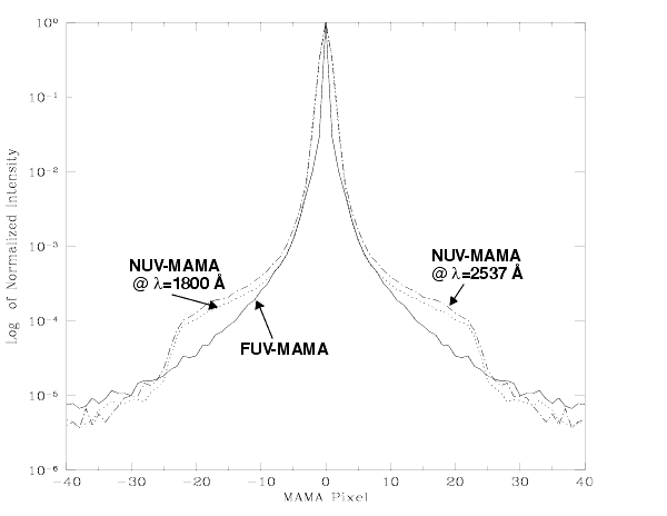 NUV-MAMAPSF being considerably worse. Sample MAMA detector PSFs are shown in Figure 7.14. For those wishing to model their effect on absorption- or emission-line equivalent-width measurements or coronagraphic observations, the LSFs and detector PSFs are maintained on the STScISTIS World Wide Web site.Data for spectral modes can be found at: