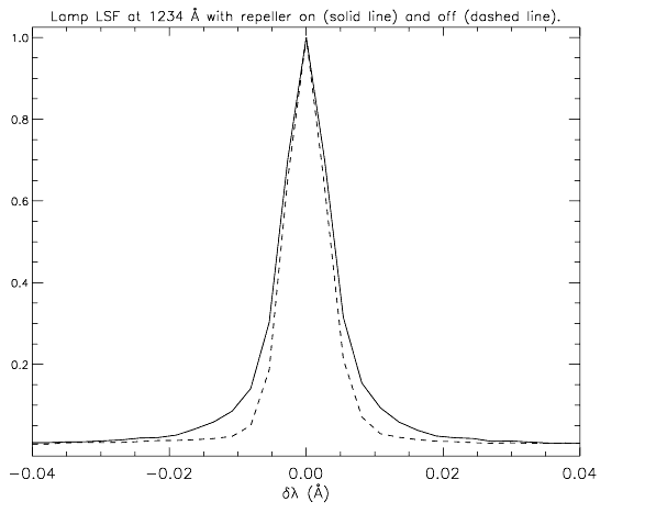 E140H, and perhaps also theE140M, gratings when used with the0.1X0.03aperture (sometimes called the "Jenkins slit") for observations shortward of 1400 Å. In pre-launch testing, resolutions as high as R ~ 220,000 were obtained in observations of a mono-isotopic emission line lamp in highres mode (see Highres), and R ~ 200,000 has been achieved on-orbit (Jenkins 2000, BAAS 32, 731). Figure 7.15 shows the effect of disabling the repeller voltage for the case of an observation of a linelamp with theE140Hcenwave =1234 Å setting. Note that the main difference is not the FWHM of the central core, but a decrease in the intensity of the line wings.Only a small number of proposals per cycle (of the order of one to two) requesting the repeller off mode will be accepted. Note that repeller off observations will require special treatment, so a scientific case will need to be made for why these observations are necessary.