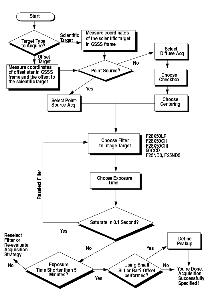 MODE=ACQ/PEAKUP) must be taken following the target acquisition exposure to refine the centering of point or point-like sources in slits less than or equal to 0.1 arcsecond wide (or tall). Peakup exposures use a slit or coronagraphic aperture and are taken with the CCD as the detector and with either a mirror or a spectroscopic element in position on the grating wheel. Typical target acquisition centering accuracies following a peakup sequence are 0.05 times the dimension of the slit or bar. Typical STIS imaging point source peakups take ~5-10 minutes; see Table 8.5 for the formulae needed to determine the duration of a peakup acquisition.Figure 8.2 shows the complete decision tree for STIS target acquisitions.
