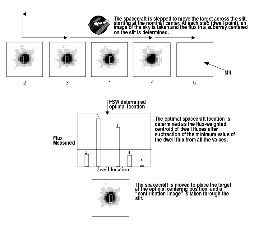 Figure 8.9 illustrates the basic peakup sequence. When a peakup exposure is performed, the telescope is moved to step the target across the slit or bar. At each step (or dwell point), an image1 of the sky is taken and the total flux in a specified subarray is determined. To allow for a more accurate calculation, the minimum flux value in the peakup (the PEDESTAL) is subtracted from each step. The flight software (FSW) then selects the position of maximum flux, using a flux-weighted centroiding technique to determine the optimum position to a fraction of a dwell step. At the conclusion of the