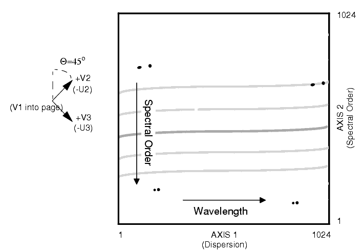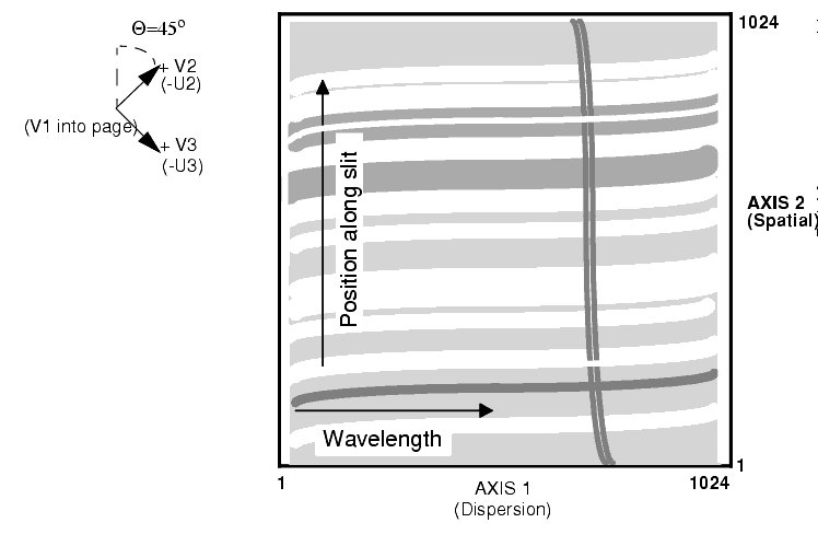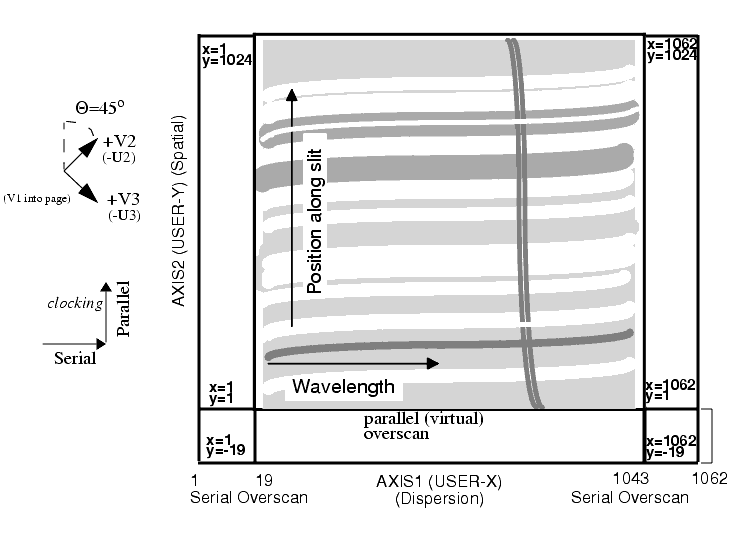 Figure 11.1: CCD ACCUM Mode Format for a Long-Slit Spectrumaxis1(image x or along a row of the CCD), and the spatial dimension of the slit runs alongaxis2(image y or along a column of the CCD). Figure 11.1 illustrates the full CCD format and its orientation with respect to the spacecraft (U2 and U3 or V2 and V3) axes. Arrows indicate the orientation of the parallel and serial clocking. The readout directions depend on the amplifier used. For the default amplifier D, the readout is at the upper right corner. It includes 19 columns of leading and 19 columns of trailing physical overscan inaxis1, and 20 trailing rows of virtual overscan inaxis2. The trailing serial overscan as well as the parallel overscan pixels are used to determine the bias level in post-observation data processing. The parallel overscan can also be used in the diagnosis of charge-transfer problems.