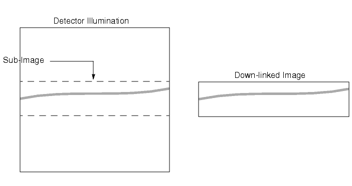 Figure 11.2: Using Subarraysacq/peakobservations to limit the region in a diffuse object (e.g., a galaxy) over which the flux is summed for the peakup. When a subarray is used, only the portion of the detector which is within the specified subarray is read out and transmitted to the ground (see Figure 11.2-note that the spectrogram curvature is exaggerated in this figure).