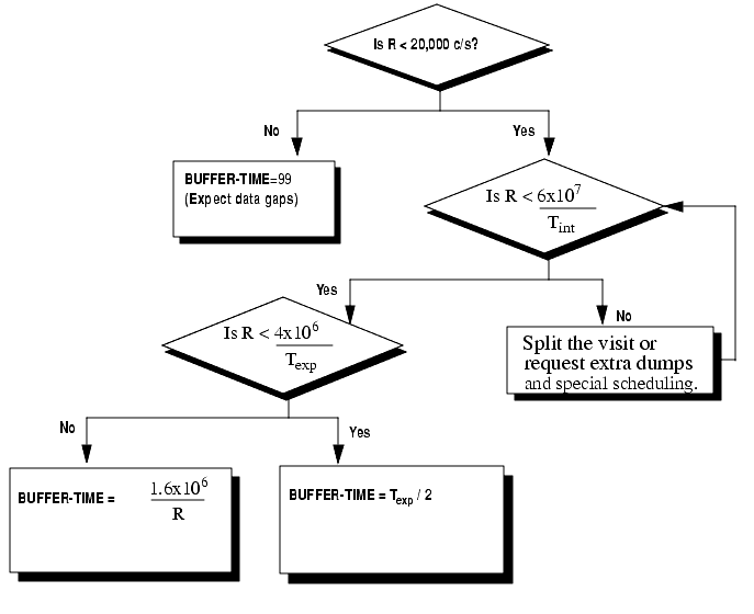 Figure 11.6: Estimation ofBUFFER-TIMEshould be less than 2 x 106/R, but longer than 1/30 the total exposure time and longer than 99 seconds. In some cases it will not be possible to satisfy all of these criteria, in which case multiple shortACCUMexposures should be considered as an alternative.BUFFER-TIME. Tint refers to the total integration time (in sec) of all the exposures in the visit, and Texp refers to the integration time (in sec) of the particular exposure under consideration.