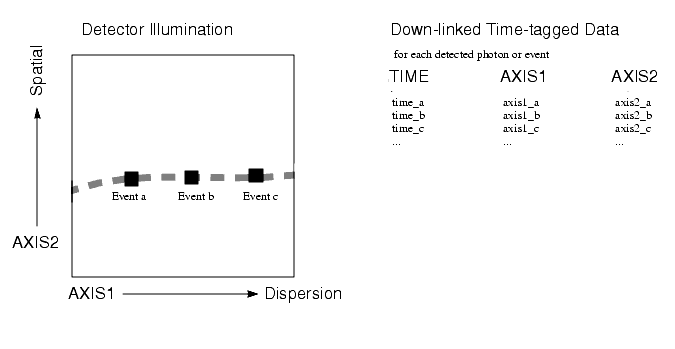 Figure 11.5: TIME-TAG ModeTIME-TAGis the same as inACCUMmode (see Figure 11.3). The spacecraft time (absolute zero point of the time) is routinely known to 10 millisecond accuracy. No Doppler correction is applied by the flight software forTIME-TAGmode, but the correction can be applied during the post-processing of the data. The recorded times are the spacecraft times, which can be converted to heliocentric times using the ephemeris of the Earth and the spacecraft.TIME-TAGmode is illustrated in Figure 11.5. Processing ofTIME-TAGdata by the STScI pipeline is described in Section 15.1.