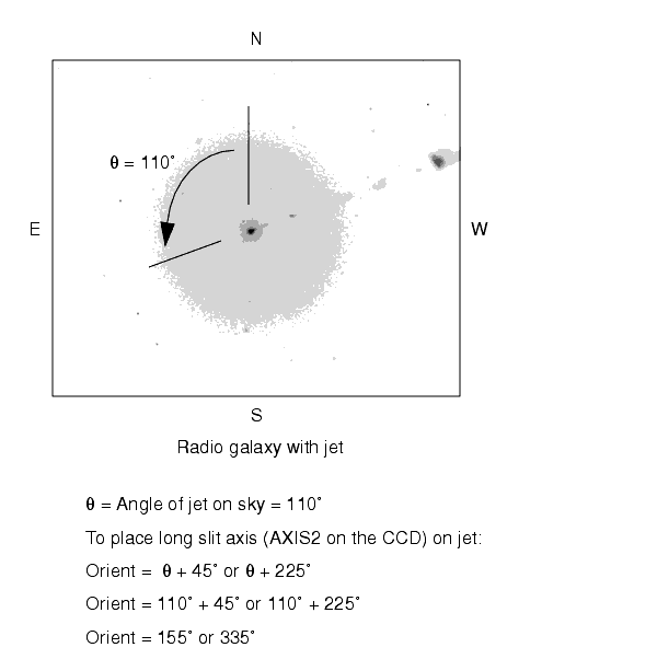 Figure 11.10: Placing the STIS Long Slit Along the Jet of M87ORIENTparameter to place the long slit along the M87 jet. Figure 11.11 illustrates how to set theORIENTparameter to fix the dispersion axis forPRISMobservations to be perpendicular to a double star system.
