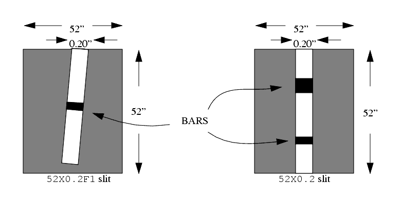 52X0.2F1aperture is the same physical slit as52X0.2with the target centered on the smaller of the two occulting bars (i.e., 0.5 arcseconds), instead of at the center of the52X0.2long slit. When this aperture is specified the slit wheel is rotated slightly to bring the bar into the center of the detector's field of view. This results in a tilt of 1.30o with respect toAXIS2(i.e., the spatial axis perpendicular to the dispersion). Also, the full 52 arcseconds length of the long-slit field of view is decreased by about 20% for CCD spectroscopy.This occulting bar is well suited to scientific programs conducting spectroscopy of faint extended material around a bright central source. Typical examples of such a program include QSO host galaxies, dynamics of jets in young stellar objects, and spectroscopy of resolved binaries. Observers performing barred spectroscopy should be sure to consult the section Section 13.7.3. Spectroscopic observations with the 0.5 arcsecond occulting bar are limited to first-order spectroscopic modes.
