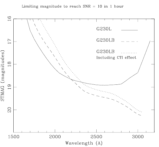 G230LBor theG230L(which uses theNUV-MAMA), depends sensitively on the science goals and your source properties.Figure 13.22: Comparison of Limiting Magnitudes and Fluxes for G230LB and G230L. Plotted are the limiting source magnitudes and fluxes for G230LB and G230L to achieve a signal-to-noise ratio of 10 per 2-pixel spectral resolution element integrated across the PSF, in 1 hour. The prediction due to the Charge Transfer Inefficiency (CTI) effect, expected in the year 2005, is also shown.