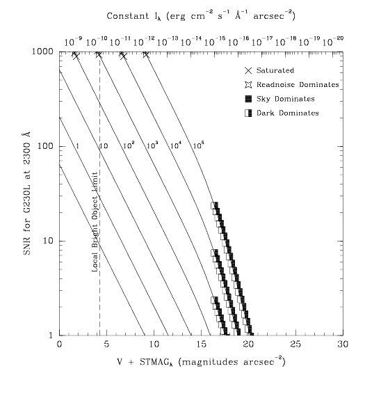 Figure 13.32: Diffuse Source Signal-to-Noise as a function of STMAG for G230Lvalues corresponding to the STMAG units (V+STMAG