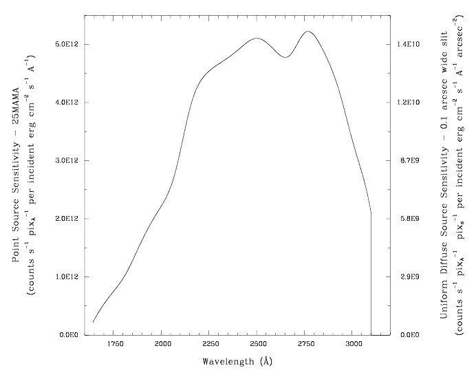 Point source sensitivity assumes full transmission (zero slit losses). Diffuse source sensitivity assumes a 0.1" wide slit. To convert point source sensitivities to diffuse source sensitivities multiply the point source values by the grating spatial (cross dispersion) plate scale in units of arcseconds per pixel and by the width of the desired slit in units of arcseconds.