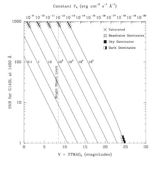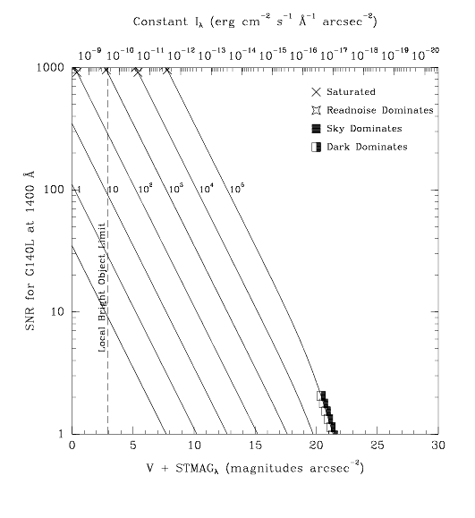 Figure 13.40: Diffuse Source Signal-to-Noise as a Function of STMAG for G140Lvalues corresponding to the STMAG units (V+STMAG