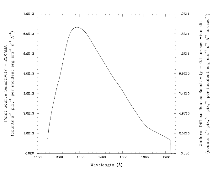 Point source sensitivity assumes full transmission (zero slit losses). Diffuse source sensitivity assumes a 0.1" wide slit. To convert point source sensitivities to diffuse source sensitivities multiply the point source values by the grating spatial plate scale in units of arcseconds per pixel and by the width of the desired slit in units of arcseconds.