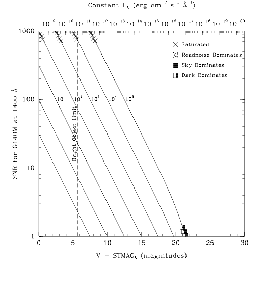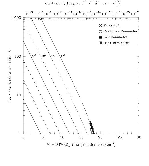 Figure 13.44: Diffuse Source Signal-to-Noise as a Function of STMAG for G140Mvalues corresponding to the STMAG units (V+STMAG