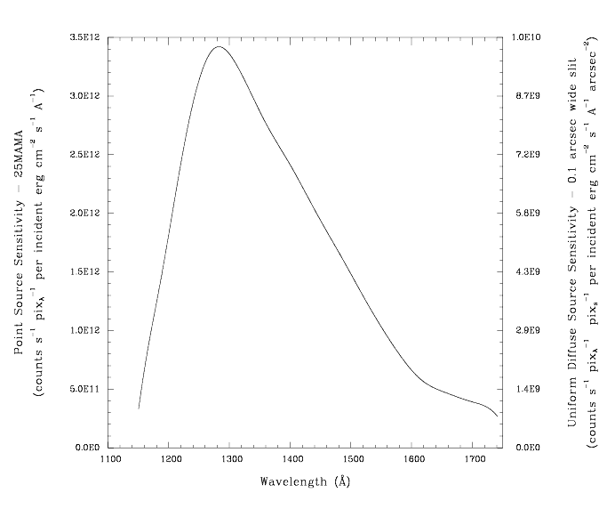 Point source sensitivity assumes full transmission (zero slit losses). Diffuse source sensitivity assumes a 0.1" wide slit. To convert point source sensitivities to diffuse source sensitivities multiply the point source values by the grating spatial plate scale in units of arcseconds per pixel and by the width of the desired slit in units of arcseconds.