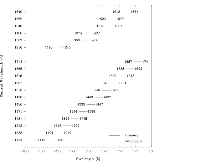 G140Mgrating mode is used with theFUV-MAMAand has a spectral range from 1150 to 1700 Å.With a resolving power R~10,000, a single exposure with this grating covers only 55 Å. The grating must be scanned, with a series of exposures taken at 12 distinct settings to cover the full spectral range.