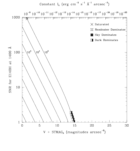 Figure 13.60: Diffuse Source Signal-to-Noise as a Function of STMAG for E140Hvalues corresponding to the STMAG units (V+STMAG