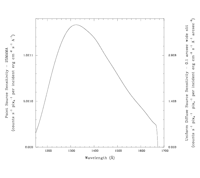 Point source sensitivity assumes full transmission (zero slit losses). Diffuse source sensitivity assumes a 0.1" wide slit. To convert point source sensitivities to diffuse source sensitivities multiply the point source values by the grating spatial (cross dispersion) plate scale in units of arcseconds per pixel and by the width of the desired slit in units of arcseconds.