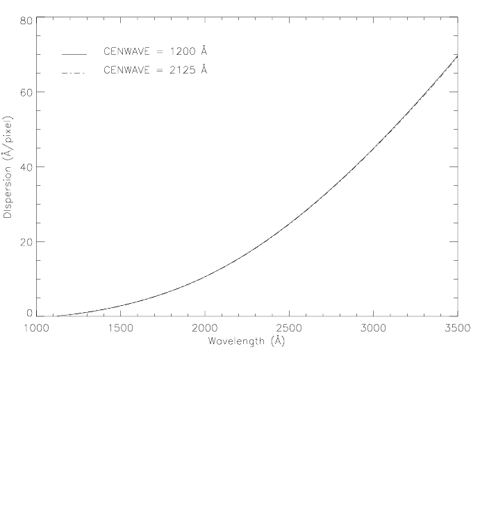 Figure 13.64: PRISM dispersion-wavelength relationship.PRISMis shown in Figure 13.64. The relationships between the wavelength and the pixel number for the two wavelength settings are given in Figure 4.13.