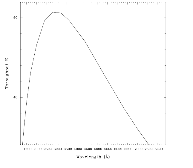 Figure 13.65: 52X0.05 Aperture Throughput as a Function of Wavelength.PEAKUPprior to science observations. The actual width of this aperture is 34 milliarcsec instead of 50 milliarcsec, the value suggested by its name. Special pseudo-apetures have been defined to minimize detector effects such as background and CTE. See next page for more information.