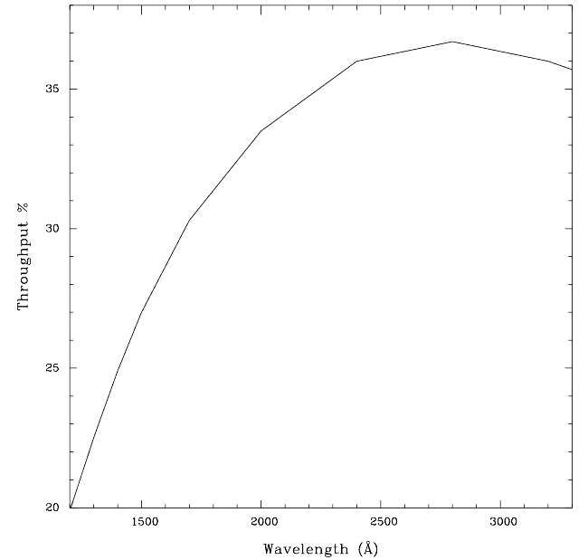 Figure 13.75: 0.1X0.03 Aperture Throughput as a Function of WavelengthPEAKUP. The peakup is performed in two stages - first with the0.2X0.09aperture (or one of the small neutral density apertures), and then with the0.1X0.03aperture.