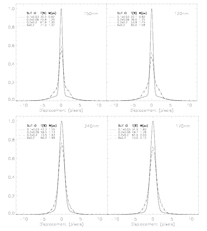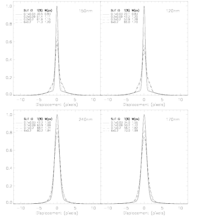 Slit Spectral Resolution (FWHM in pixels) Point Source Extended Source 1200 Å 1500 Å 1700 Å 2400 Å0.1X0.030.2X0.20.2X0.096X0.2