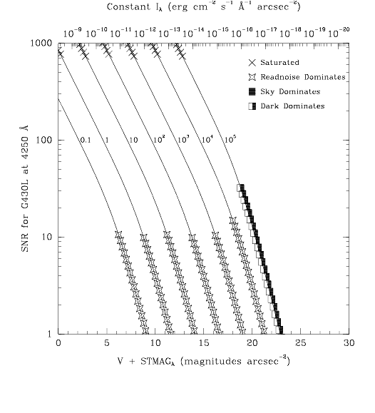 Figure 13.12: Diffuse Source Signal-to-Noise as a Function of STMAG for G430Lvalues corresponding to the STMAG units (V+STMAG