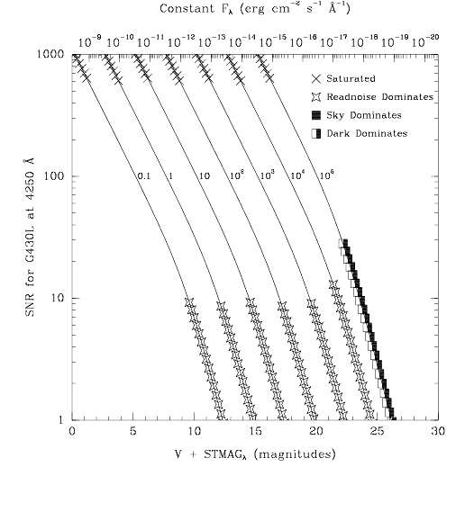 Figure 13.13: Point Source Signal-to-Noise as a Function of STMAG for G430L