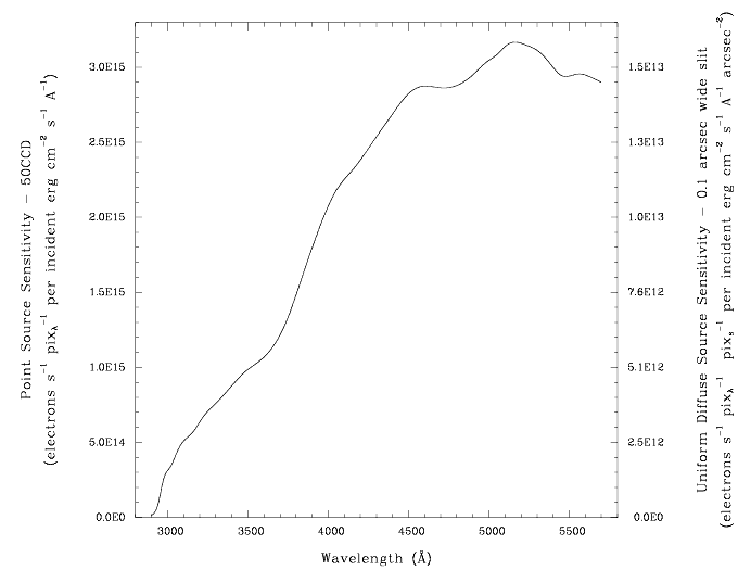 Point source sensitivity assumes full transmission (zero slit losses). Diffuse source sensitivity assumes a 0.1" wide slit. To convert point source sensitivities to diffuse source sensitivities multiply the point source values by the grating spatial (cross dispersion) plate scale in units of arcseconds per pixel and by the width of the desired slit in units of arcseconds.